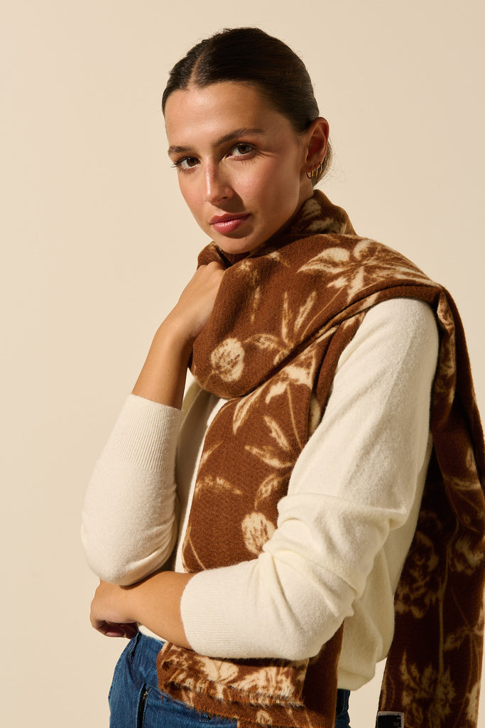 Cette écharpe parsemée de motifs floraux est à nouer selon vos envies. Pliée en deux, enroulée autour du cou, elle accompagne toutes les tenues, à porter sur une veste, un blouson ou un manteau.